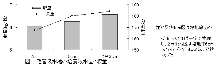排液を出さない環境保全型養液栽培の毛管吸水槽の培養液水位管理は、培養液面から培地底面までの距離が6cmになったら2cmになるまで給液する。培地への給液量は全給液量の50%程度とし、残りの約50%は毛管吸水槽に給液する。 |