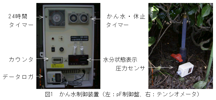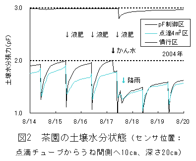 愛知県が開発したかん水制御装置は、土壌水分を設定通りに制御でき、茶園の水分動態を把握することができる。また点滴施肥栽培にpF制御方式を組み合わせた栽培体系により、従来より水量を低減することができる。 |