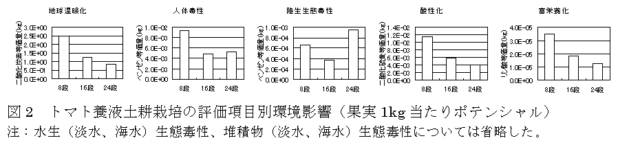 トマト養液土耕栽培の環境影響を、気候変動等の環境影響評価項目ごとに果実1kg当たりで評価すると、富栄養化への影響が慣行栽培より減少すること、気候変動、酸性化、富栄養化の各評価項目において収穫段数の増加につれ環境影響が減少することがわかる。 |