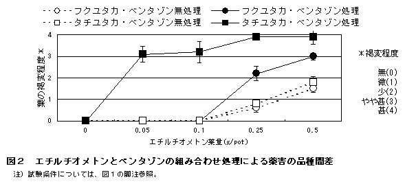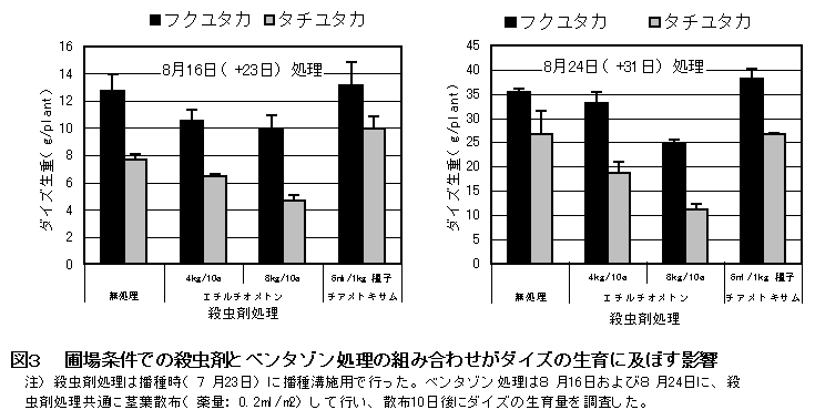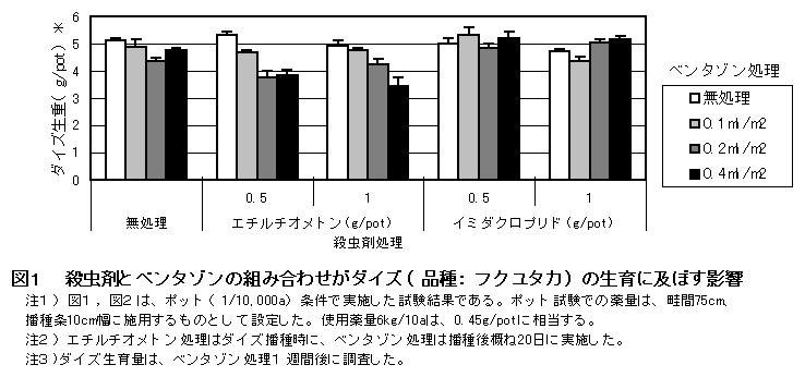 殺虫剤エチルチオメトンをダイズ播種時に処理し、生育期に除草剤ベンタゾンを茎葉処理すると、両剤の処理間隔が1ヶ月程度あっても激しい薬害を招く。イミダクロプリド等の非有機リン系殺虫剤とベンタゾンとの組み合わせでは、同様な薬害は発生しない。 |
