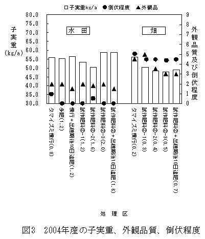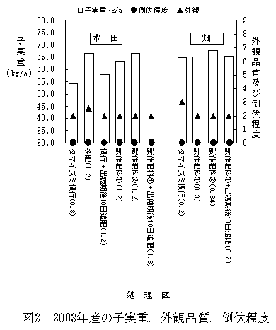 醤油用として小麦「タマイズミ」の粗タンパク質含量12%を達成するには、灰色低地土の水田では、タマイズミ専用肥料666の基肥N1.2kg/a施用+出穂期後10日のN0.4kg/a追肥の体系が、黒ボク土の畑では、出穂期後10日のN0.4kg/a追肥が有効である。また、出穂期に止葉の葉色値が48以上(SPAD)であれば追肥を省くことができる。 |