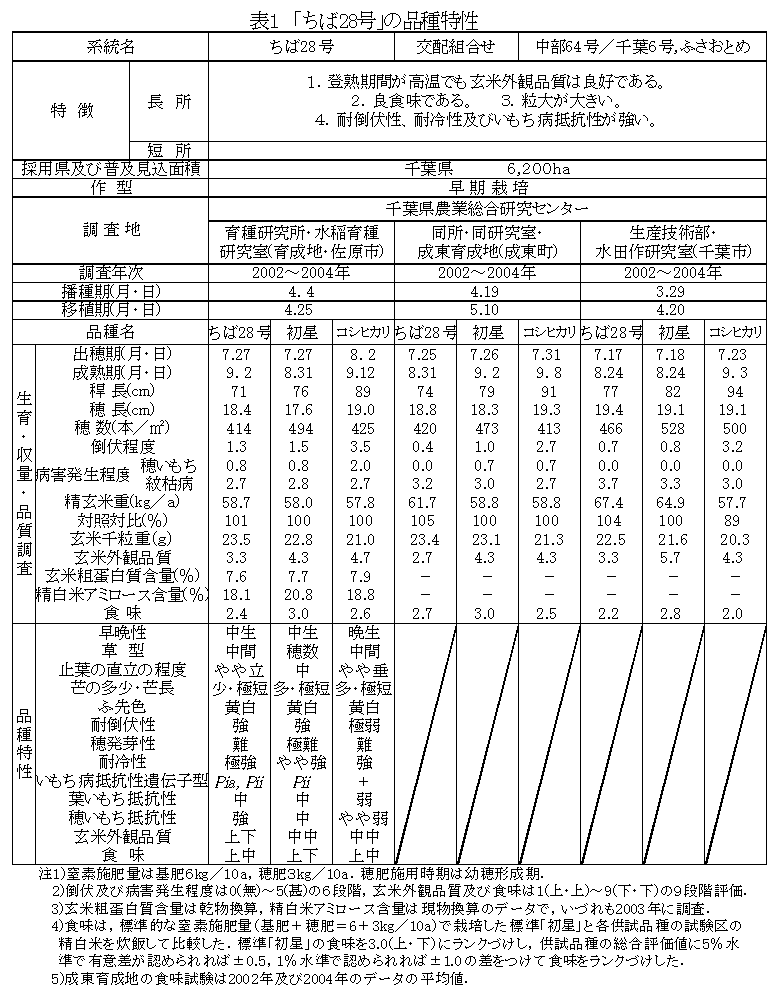 [キーワード]ちば28号、水稲、早期栽培、いもち病抵抗性、耐冷性、良質、良食味 |