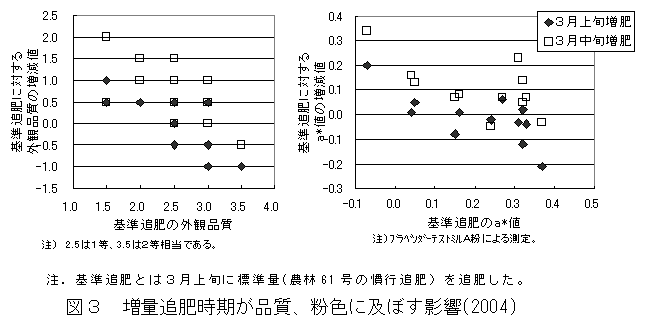 「イワイノダイチ」は耐倒伏性が強いため、3月追肥の窒素施肥量を農林61号に比べて2kg/10a増やすことで子実蛋白質含量を増加させることができる。増量追肥の適期は3月上旬で、3月中旬以降の増量追肥は外観品質、粉色の低下を伴う。 |