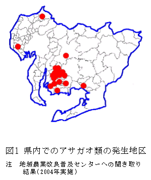 愛知県のダイズ作付けの中心地である西三河地域のダイズほ場では、難防除雑草である帰化アサガオ類(以下「アサガオ」)の発生が目立つようになってきた。とくに近年、アサガオの発生による収穫等作業性の低下が問題視されてきており、多発地域の農家からは防除法の確立について強い要望が出ている。 |