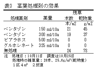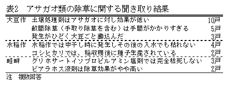 転作大豆ほ場における帰化アサガオ類の発生は1996年頃から急激に拡大しており、転作が3年間固定される地域で多くなっている。ほ場内の発生に前作は関係なく、前作水稲の場合であってもアサガオは多発し、難防除雑草として問題化している。防除方法として、土地利用方式の見直し、畦畔や稲収穫後の雑草管理等の対策が有効である。 |