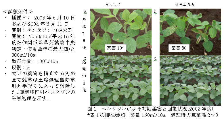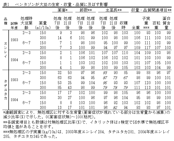 ベンタゾンを茎葉処理した大豆品種エンレイ・タチユタカの初期薬害症状と収量 |
