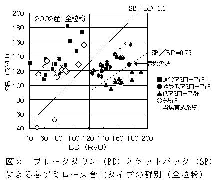 ラピッドビスコアナライザーによりコムギのアミロース含量タイプの判別を行う手法を開発した。全粒粉を用い、糊化特性値のブレークダウン(BD)とセットバック(SB)とを指標にし、SB/BD比を併用することで、各アミロース含量タイプを群別することができる。 |
