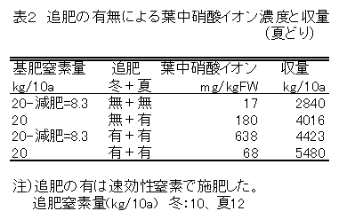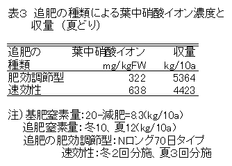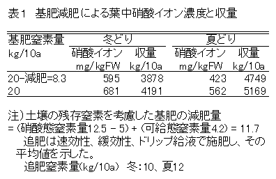 基肥は、土壌の残存窒素量に応じて減肥し、冬どり前は追肥せず、翌年の夏どり前に肥効調節型肥料(70日タイプ)で施肥すると、目標収量(3t/10a)を確保でき、ニラの葉中硝酸イオン濃度は慣行栽培に比べて半減する。 |