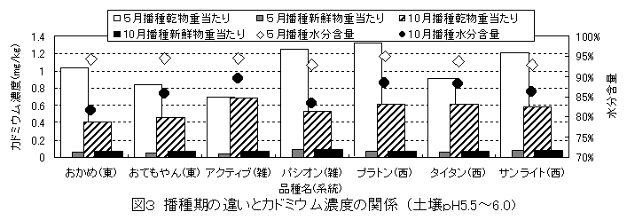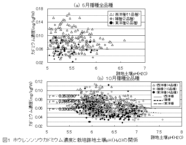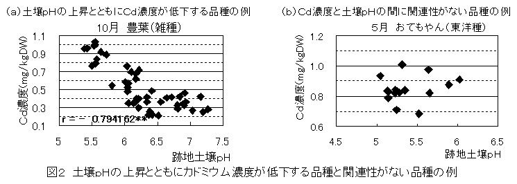 一般に、土壌pHが高いと作物のカドミウム吸収が抑制され、ホウレンソウにおいても、土壌pHを高めるとカドミウム濃度の高い個体が出現しにくくなる。しかし、品種によっては土壌pHを高めてもカドミウム濃度は低下しない。 |