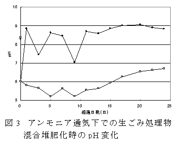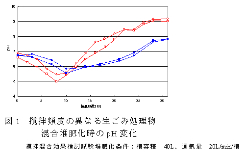 生ごみ処理物混合割合が高い堆肥化条件では、堆肥化過程での酸素消費が大きいため、嫌気状態の部分が多くなり、pHが低下し易い。効率的な堆肥化を行うためには、頻繁な撹拌混合(1回/2日程度)による好気状態の維持及びアンモニア供給によるpHの維持が有効である。 |