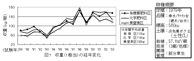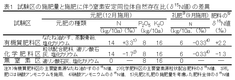 有機質、化学肥料の長期連用がニホンナシの収量・品質および窒素安定同位体自然存在比(δ15N値)に与える影響 |