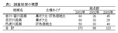 水田の多面的機能のひとつである水質浄化機能を評価する。そこで、移植から20日以降の水田の水質を広域的に調査し、用水の水田通過による栄養塩類の濃度変化の実態ならびに黒ボク土水田および灰色低地土水田での違いを明らかにする。 |