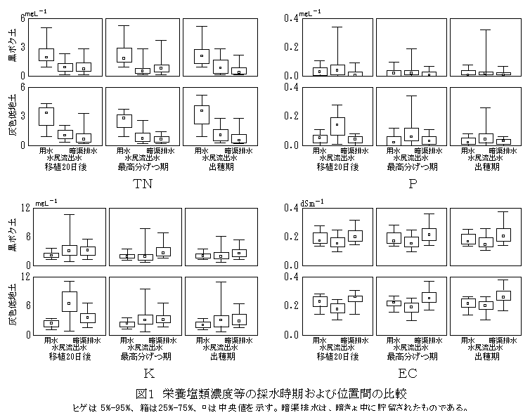 移植から20日以降の水田で、全窒素濃度は水尻および暗渠排水で低下する。リン酸濃度は移植20日以降、継続して水尻で上昇し、その程度は灰色低地土水田で、また、時期が早いほど大きい。カリウム濃度は移植20日後、水尻で上昇する。 |