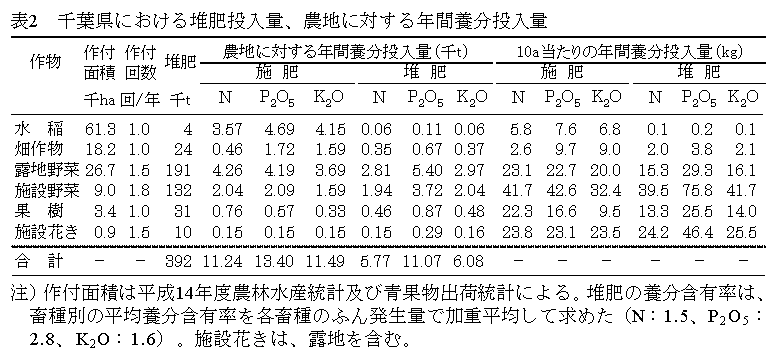 千葉県では、施肥窒素量(10a当たり)は水稲が5.8kg、カンショが0.8kg、施設果菜が23kgであり、施用堆肥量(10a当たり)はそれぞれ3kg、344kg、1,646kgである。農地に対する年間の窒素投入量は、施肥で11,200t、堆肥で5,800tと推定される。 |