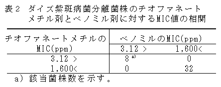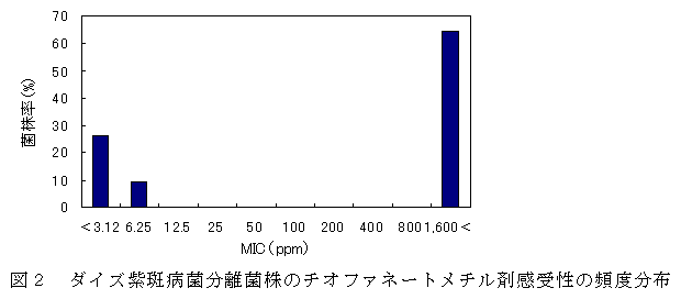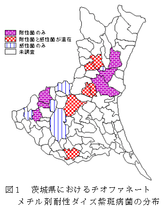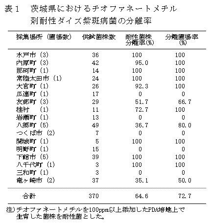 茨城県で分離したダイズ紫斑病菌の菌株の64.6%は、チオファネートメチル剤耐性菌で、本耐性菌は県内に広く分布している。 |