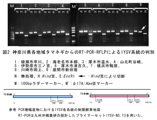 神奈川県各地域のネギ及びタマネギ圃場においてアイリスイエロースポットウイルス(IYSV)の感染が認められる。汚染圃場のネギアザミウマは一割以上が媒介能力を有し、近隣で被害が懸念される作物圃場では本媒介虫の侵入に注意が必要である。 |