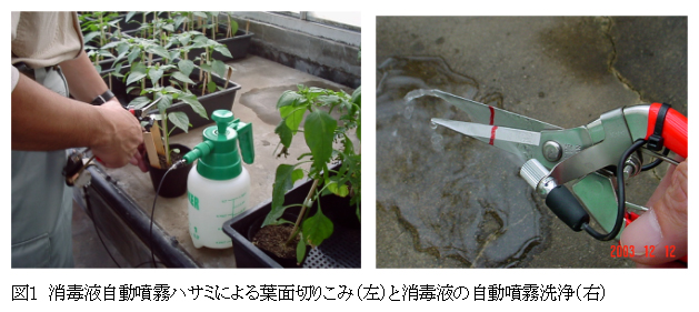 消毒液自動噴霧ハサミを用いたピーマンモザイク病の接触伝染防止 |