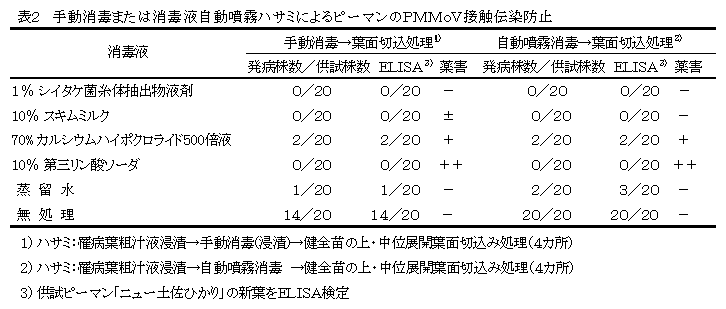 トウガラシマイルドモットルウイルス罹病ピーマンの葉柄切断や葉面への切り込み時に、シイタケ菌糸体抽出物液剤やスキムミルク水溶液で消毒液自動噴霧ハサミの刃を洗浄すると、隣接する健全ピーマン株へのPMMoVの接触伝染が防止される。 |