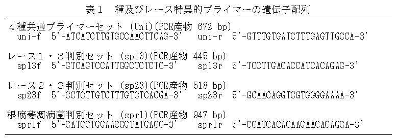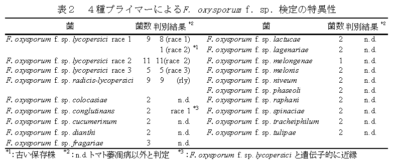 Fusarium oxysporum f. spのpolygalacuturonaseの遺伝子配列をもとにトマト萎凋病菌に特異的な4種類のプライマーを開発した。各プライマーを組み合わせることによりトマト萎凋病菌の各レース並びにトマト根腐萎凋病菌を迅速に判別できる。 |