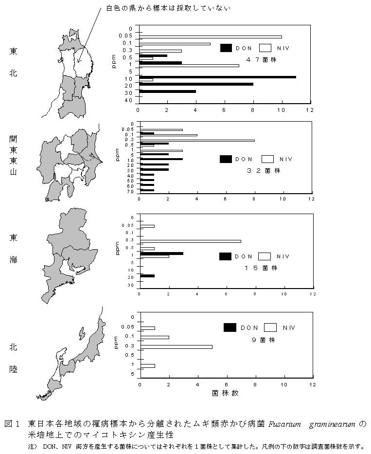 東日本では、ムギ類赤かび病菌としてFusarium graminearumが優占し、米培地でデオキシニバレノール(DON)、ニバレノール(NIV)の一方、あるいはその両者またはゼアラレノンを産生する。また、DON、NIVの産生能が高い菌株は各々約半数を占める。 |