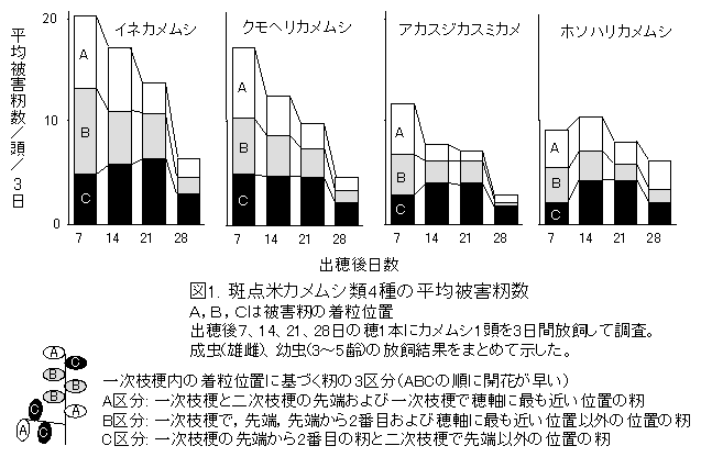 イネカメムシ、クモヘリカメムシ、アカスジカスミカメは、胚乳が縦伸長途中から幅伸長途中の籾を主に加害し、ホソハリカメムシはより登熟が進んだ籾も加害する。籾の加害部位は、カメムシの種による特異性が高い。 |