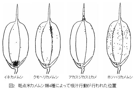 斑点米カメムシ類は特定の発育段階の籾を好み種特有の加害部位がある |