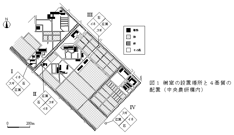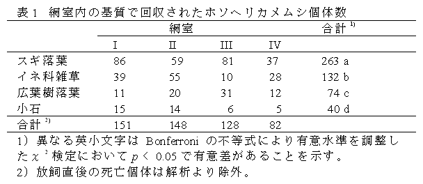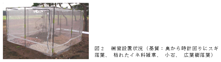 野外に設置した網室内で、ホソヘリカメムシ成虫は越冬場所として想定される4基質を、スギ落葉>枯れたイネ科雑草>広葉樹落葉>小石の順に選好する。 |