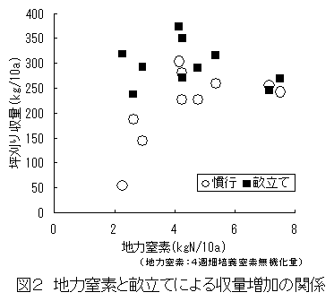 耕うん同時畝立て播種技術は埴土から砂壌土まで適用拡大できる。重埴土や軽埴土に加えて砂壌土までの幅広い土性の湿潤条件の現地営農規模で改良型アップカットロータリによる耕うん同時畝立て播種技術を実施すると、湿害が回避されて苗立ち数が向上し、収量が増加する。その効果は、地力の低い圃場においても発現する。 |