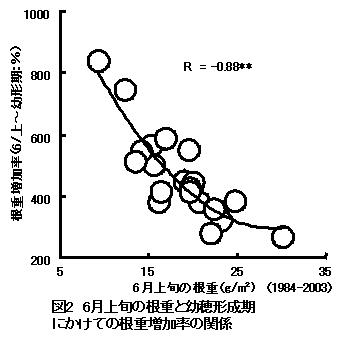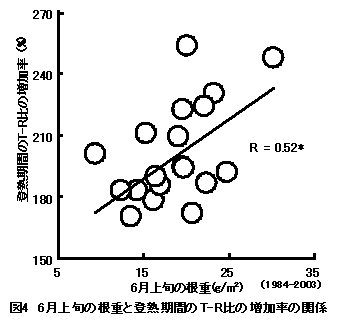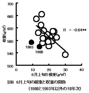20年間同一耕種条件で栽培したコシヒカリの地上部および根の生育量の推移と収量の関係について解析し、初期の根重が大きい年次には登熟期間の根重が凋落し、収量が低下する傾向を認めた。 |