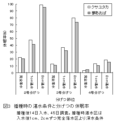 「クサユタカ」と「夢あおば」の湛水散播直播での地上部多収に必要な総窒素施用量は5月上旬播種で7~9kg/10a、6月中旬播種で4~5kg/10aである。落水不良の場合、低節位分げつが休眠し大きく減収するので苗立密度は70本/m2以上必要で、最多収量は120~160本/m2で得られる。 |