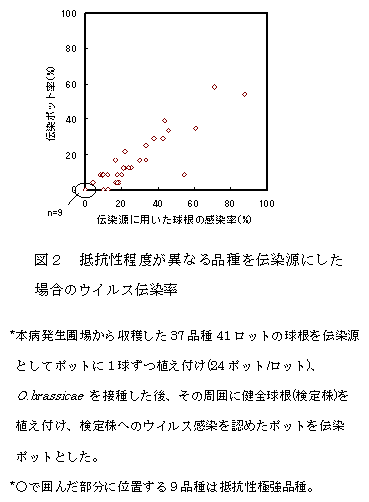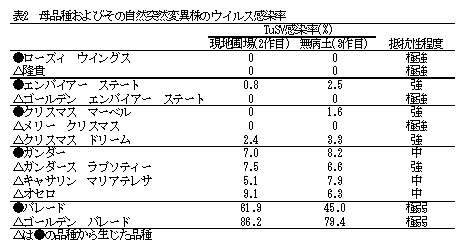 チューリップ条斑ウイルス(TuSV:仮称)によって引き起こされるチューリップ条斑病はOlpidium brassicaeによって媒介される土壌伝染性の難防除病害である。本病による被害を軽減するには、抵抗性品種の利用が最も有効である。そこで、国内の主要品種について本病に対する抵抗性を評価し、抵抗性品種を利用した安定生産および新品種の育成を推進する。 |