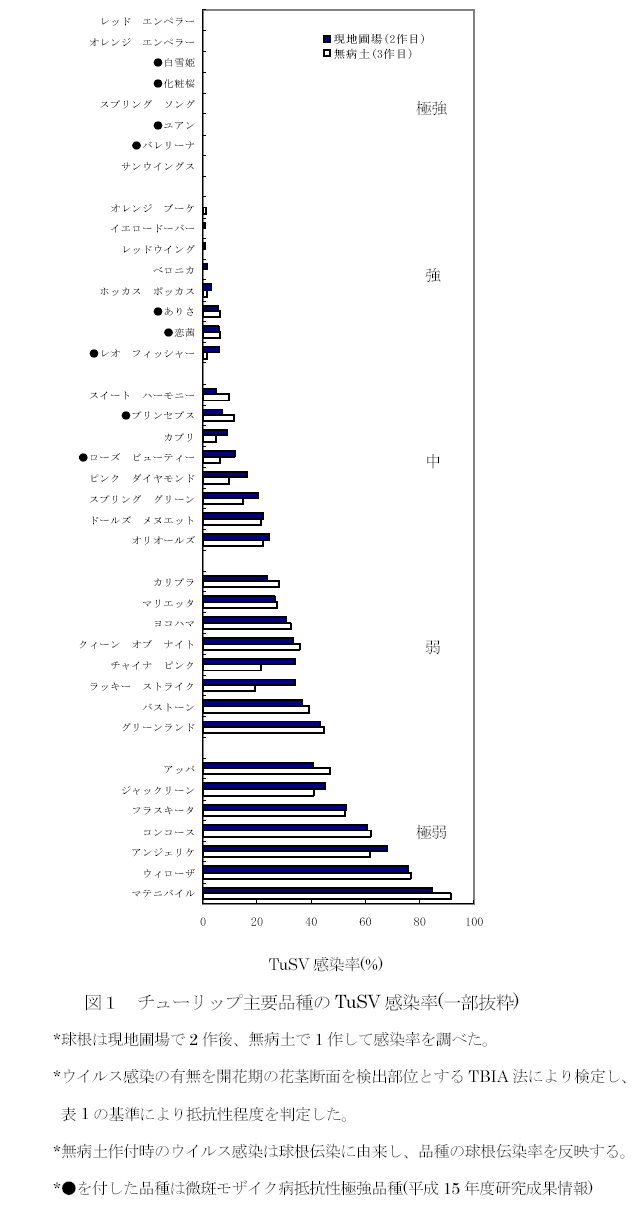 チューリップ条斑病に対する抵抗性には品種間に大きな差異が認められ、国内主要品種225品種のうち22品種が極強と判定される。抵抗性極強品種は伝染源になりにくいため、圃場の汚染程度を高めず、本病の被害軽減に有効である。 |