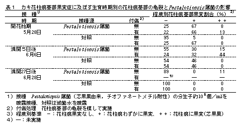 [キーワード]カキ、果実障害、花柱痕基部黒変症、Pestalotiopsis属菌、薬剤 |