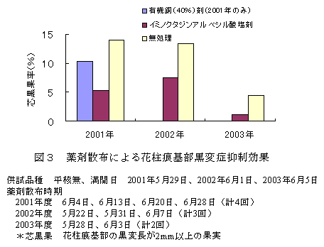カキ果実の花柱痕基部黒変症(通称:芯黒果)は、花柱痕基部の癒合不良部位に発生し、同部位にPestalotiopsis属菌が開花期始期~満開5日後頃に感染することによりその程度が助長される。開花期前後にイミノクタジンアルベシル酸塩剤を用いることにより、花柱痕基部黒変症の発生を軽減できる。 |
