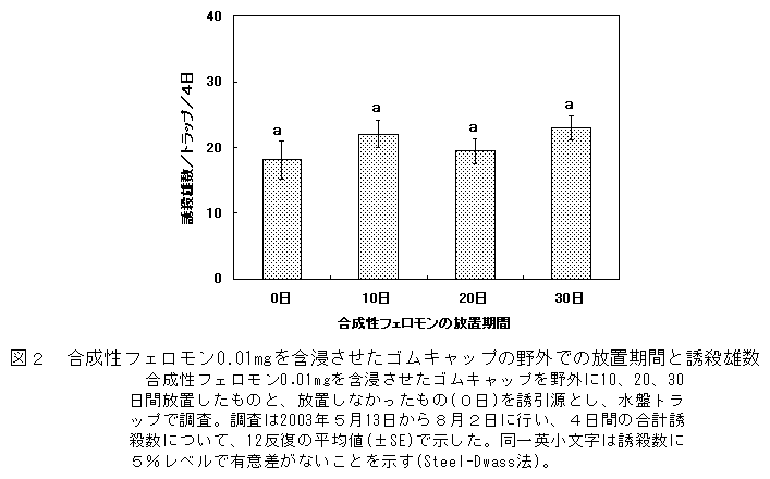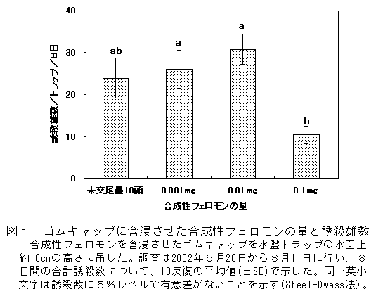 ゴムキャップに含浸させたアカヒゲホソミドリカスミカメの合成性フェロモン0.01mgは、未交尾雌10頭と同等の誘引力があり、野外でその誘引性は1ヵ月間は持続する。 |