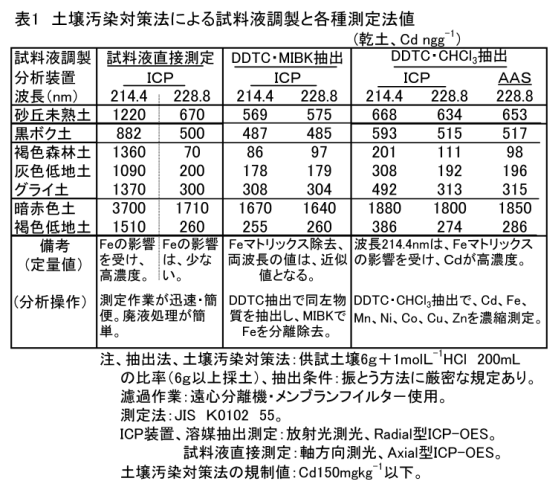 土壌汚染対策法に基づく方法に準じ、供試土壌1gを1molL-1塩酸20gで抽出し、上澄液をICP-OES(誘導結合プラズマ発光分析法)の波長228nmで測定することにより、作物体と同様にカドミウム濃度(Cd50ngg-1以上)の迅速定量分析ができる。 |