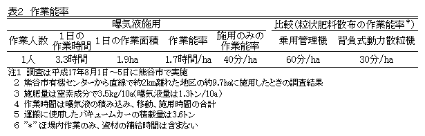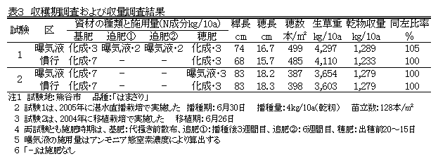 飼料イネ栽培において、家畜排せつ物処理施設等から排出される牛糞尿由来の曝気液を、2回の追肥あるいは穂肥に用いると慣行栽培と同等の収量が得られる。 |