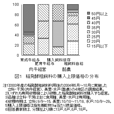 稲発酵粗飼料の評価は、給与対象牛により異なり、肉牛経営では発育や産肉性への効果が見られる育成牛に給与する経営で、酪農では自給飼料生産圃場が少なく家畜排せつ物の利用促進が課題となっている経営において、それぞれの評価を表す購入上限価格が高くなる。 |