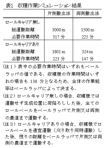 専用収穫機(飼料イネ用ロールベーラ)と自走式ベールラッパ各1台による飼料イネ収穫作業では、収穫機により梱包・結束されたロールベールを圃場外に搬出する運搬作業が、全体の作業能率を向上するうえで重要である。そこで、自走式ベールラッパの運搬作業負荷を軽減するために、専用収穫機で刈り取りを行いながら同時にロールベールを運搬するための運搬装置(ロールキャリア)を開発し、その作業性を検証する。 |