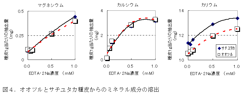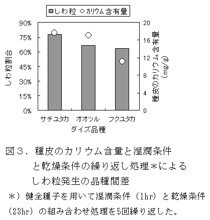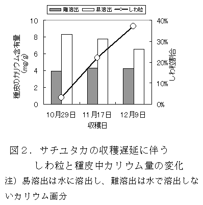 サチユタカの種皮では、フクユタカ、タチナガハに比べカルシウム含有量が低くカリウム含有量が高い。サチユタカの種皮に含まれるカリウムは結合強度の低い状態で存在することから、降雨や結露などによるカリウム溶脱がしわ粒の発生に関与する可能性がある。 |