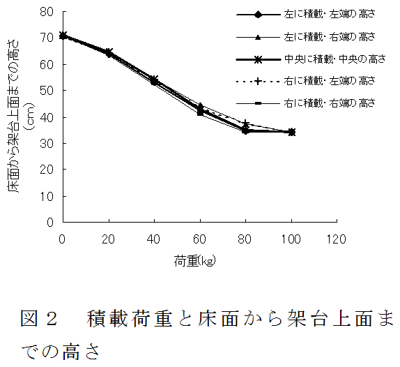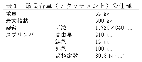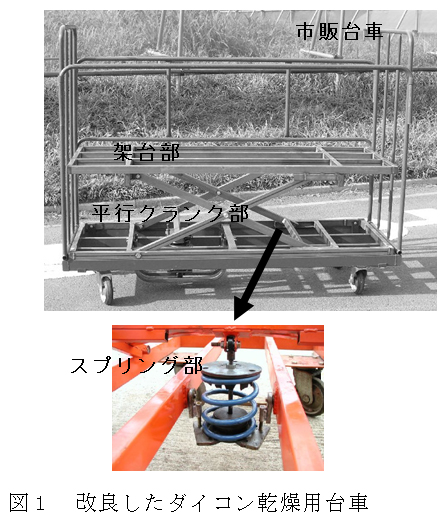 ダイコンの洗浄後に用いる乾燥用台車を架台が上下するように改良し、積載・搬出作業時に生じる腰曲げ作業の軽減を図った。平行クランク機構とスプリングを組み合わせて改良した台車は架台への積載荷重が偏っても水平を維持しながら上下に作動する。 |