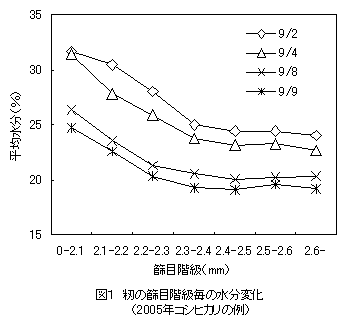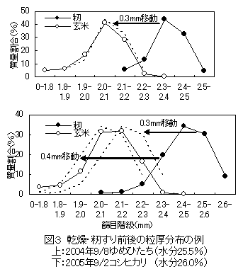 荷受け時の籾の粒厚分布と乾燥・籾すり後の玄米の粒厚分布は、0.3~0.4mm程度の差を持った相似であり、荷受け段階で、2.2~2.3mmで篩うことにより、通常、籾すり後に1.8mmで除去される細粒玄米を粗選別して、水分ムラを小さくできる。 |