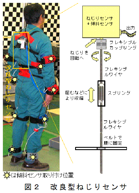 本システムは、新型作業姿勢モニタ、ねじりセンサ、データ解析ソフトから構成され、作業者に装着した身体各部の傾斜角、体幹部のねじれ角をロガーに記録すると供に、姿勢のスティックピクチャ表示、OWAS法による姿勢評価を自動的に行うことができる。 |