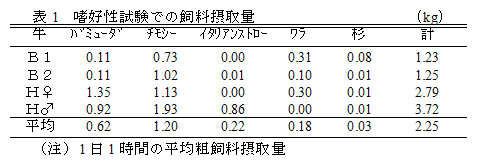 蒸煮した杉チップの嗜好性はチモシー乾草やバミューダ乾草に比べて劣るが、濃厚飼料と混合して給与することにより、粗飼料の代替として利用できる。 |