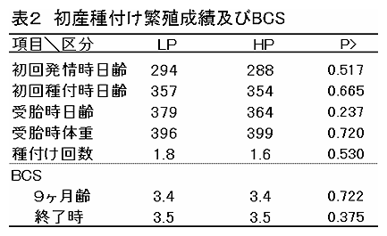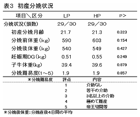 生後90日齢から初産種付け期までの栄養水準を高めることにより、21~22ヶ月齢で初産分娩させても、体格が充分であれば安全に分娩させることが可能である。しかしながら日増体量(DG)が1.0kgを上回ると初産時の乳生産を低下させる可能性がある。 |