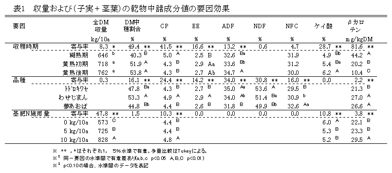 施肥水準、収穫時期、品種の違いと飼料イネの成分や第一胃内消失率の関係 |