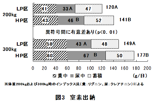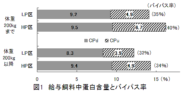 育成初期の発育促進を図るために、分解性蛋白質(CPd)含量及び非分解性蛋白質(CPu)含量を高めた飼料を給与しても発育への効果は認められない。また、CPuを高めた場合は、尿中窒素排出量が高いことから、CPu含量は給与飼料中養分含量の4~5%程度が適正である。 |