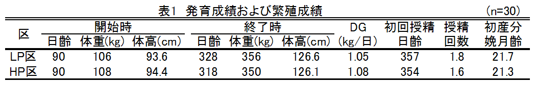 生後90日齢から初回授精時期までの栄養水準を高め日増体量(DG)を1.0kgとする飼料を給与した場合、日本飼養標準で授精目標とされる体重350kg、体高125cmに317日齢で達し、21~22ヶ月齢で安全な初産分娩は可能である。 |