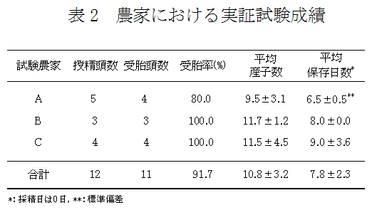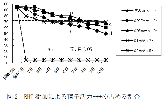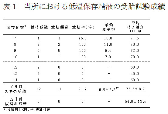 モデナ保存液にBHT0.05mMを添加し、精液温度を38時間で5℃に温度降下することにより、精子活力+++70%を10日間保持できる。農家実証試験では、家庭用冷蔵庫(5℃)で8日間保存した低温保存精液の受胎率は91.7%、平均産子数は10.8頭である。 |
