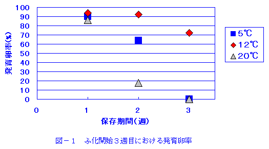 水禽(アイガモ)受精卵のふ化率を高めるには、保存温度が12℃の場合は2週間以内、保存温度が5℃の場合1週間以内に入卵することが必要である。また、保存温度が20℃の場合はふ化がほとんど期待できない。 |